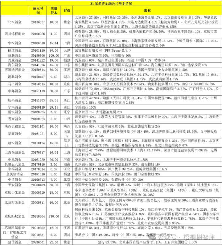 按批筹时间顺序依次为北银消费金融、锦程消费金融、苏宁消费金融、湖北消费金融、杭银消费金融、盛银消费、晋商消费金融、陕西长银消费金融、蒙商消费金融、哈银消费金融、尚诚消费金融、中原消费金融、长银五八消费金融、幸福消费金融、小米消费金融、苏银凯基消费金融以及宁银消费金融。