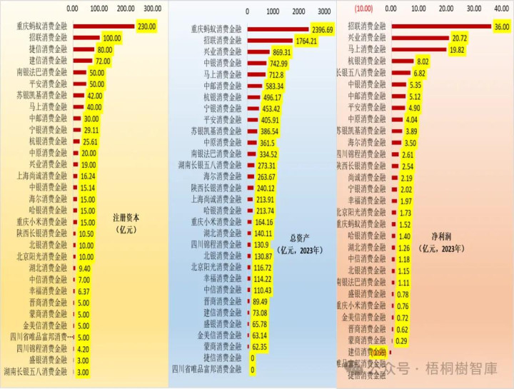 就排序来看,截至2023年底共有2家消费金融公司超过千亿(蚂蚁消费金融和招联消费金融)、6家超过500亿元,从高到低依次为兴业消费金融、中银消费金融、马上消费金融和中邮消费金融,紧随其后的几家分别为杭银消费金融、宁银消费金融、平安消费金融等。